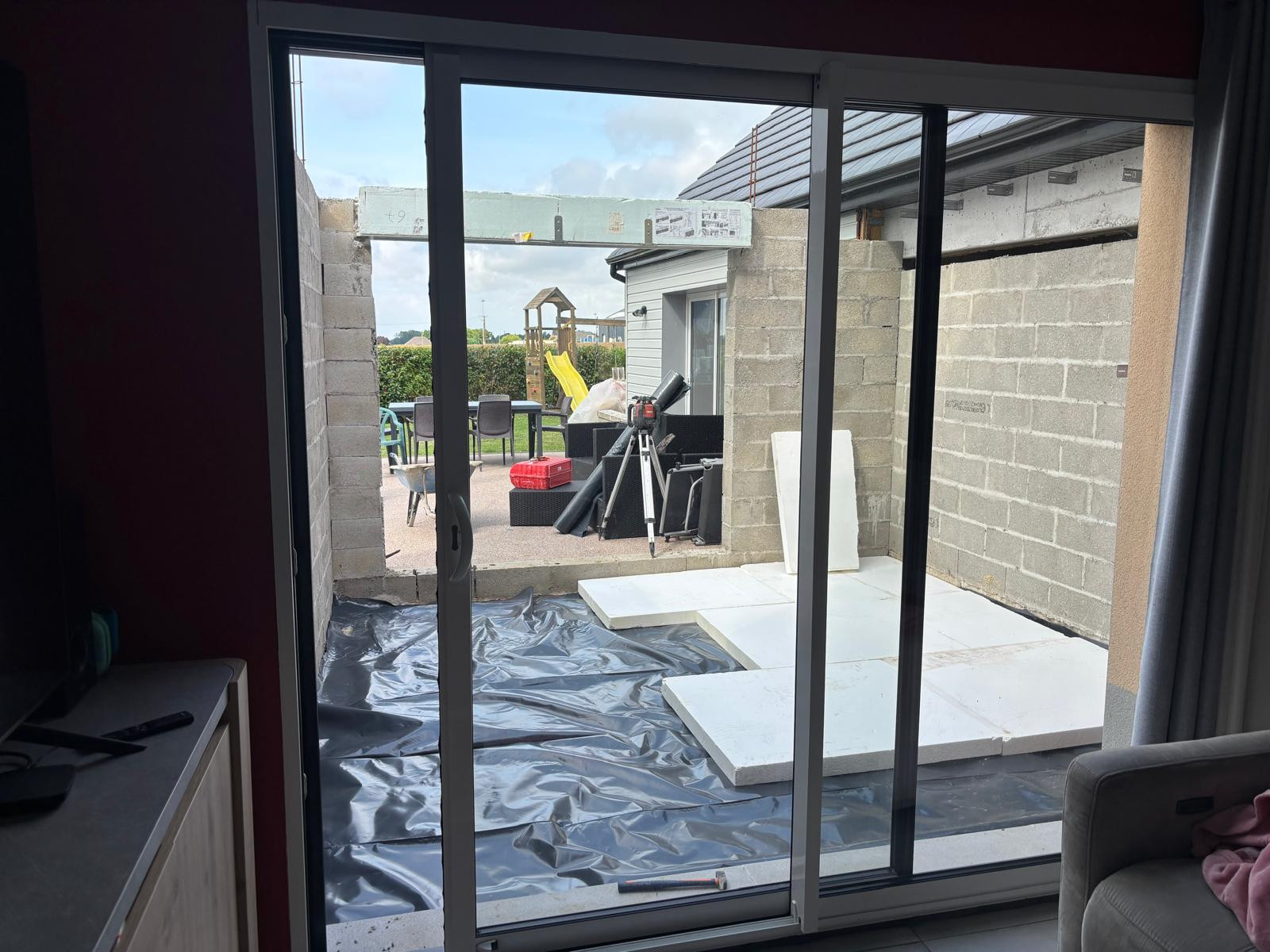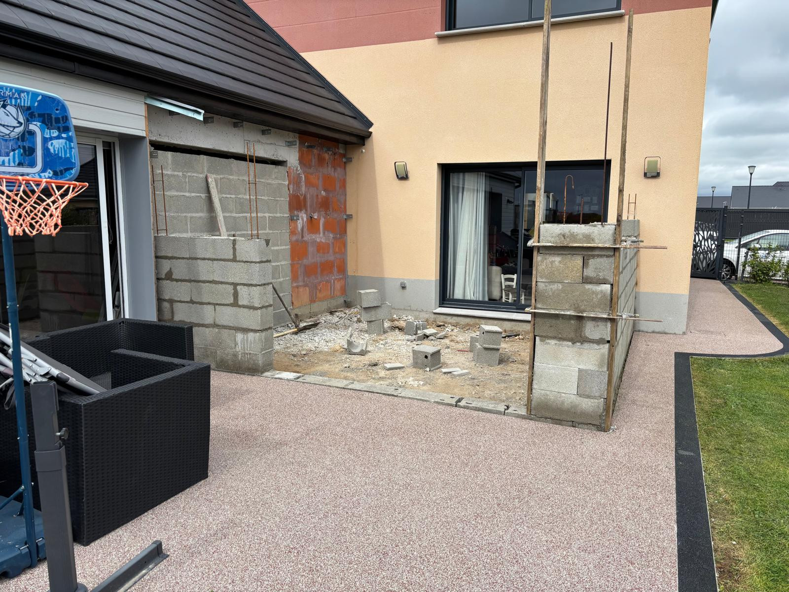 Les travaux ont débuté par la condamnation d’une fenêtre existante, étape nécessaire pour permettre la future ouverture entre l’habitation et l’agrandissement. Cette intervention a été effectuée avec soin afin de préserver la stabilité du mur porteur et d’assurer une reprise propre et durable.