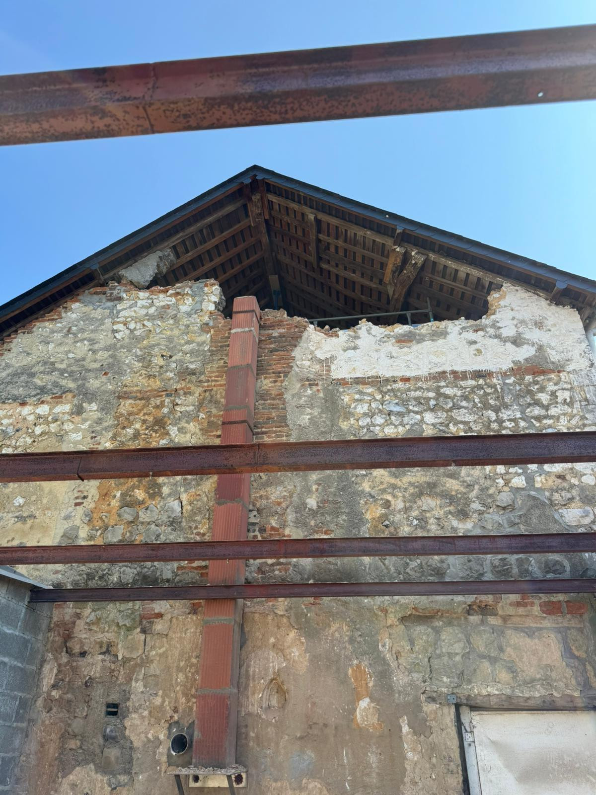 Une fois la maçonnerie terminée, l’étaiement a pu être retiré, signe d’un ouvrage stable et solidement reconstruit.