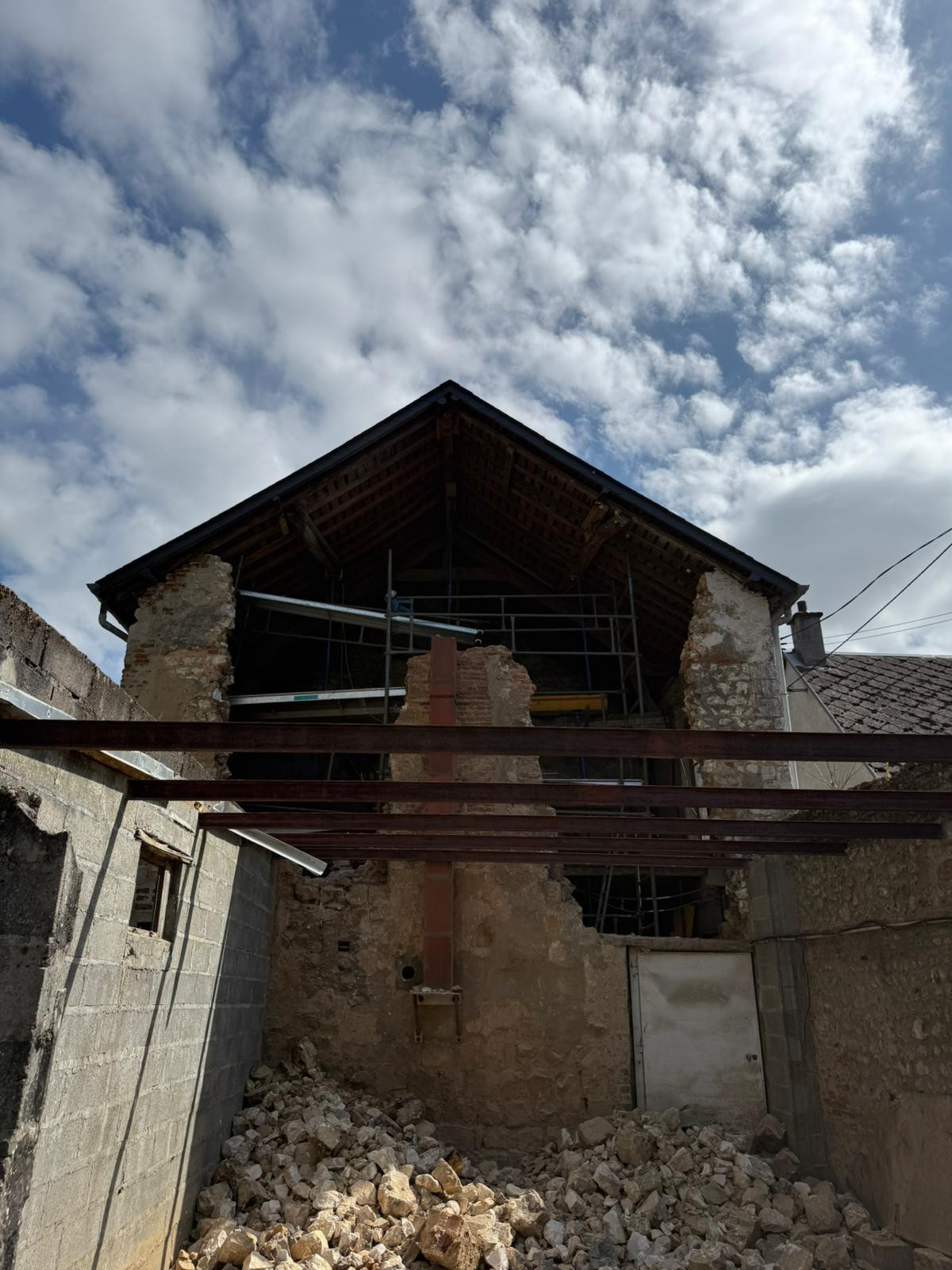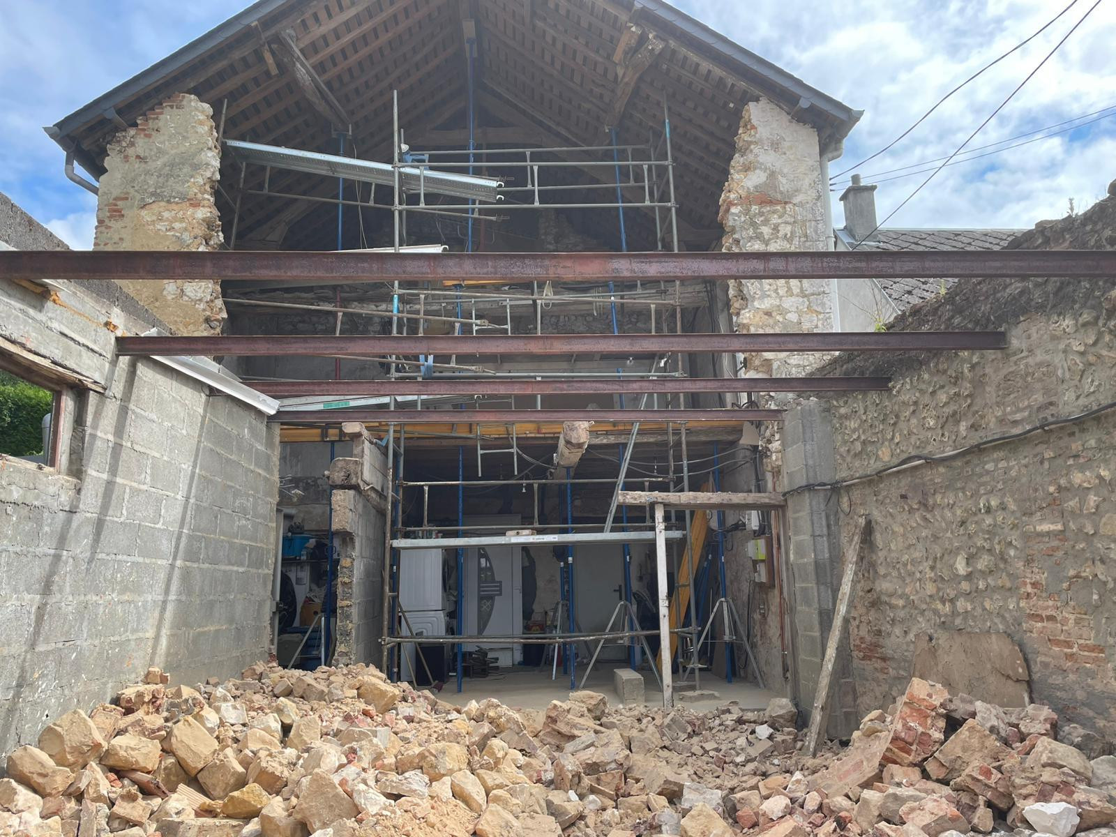 Dans un premier temps, nous avons sécurisé le chantier en procédant à un étaiement soigné de la structure. Cette étape était indispensable pour garantir la sécurité du bâtiment et permettre la suite des travaux sans risque.